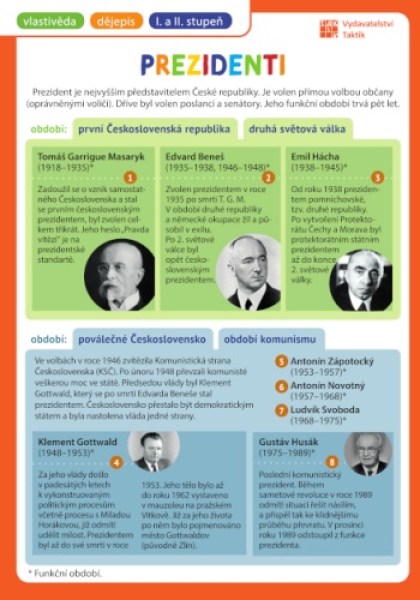 Přehledová tabulka: Prezidenti pro 1. stupeň základní školy, v jedné tabulce, která se vejde do každého sešitu či notýsku. Tento bohatě ilustrovaný a přehledný malý pomocník se hodí všem, bez ohledu na to, jestli je to školák, nebo ne.